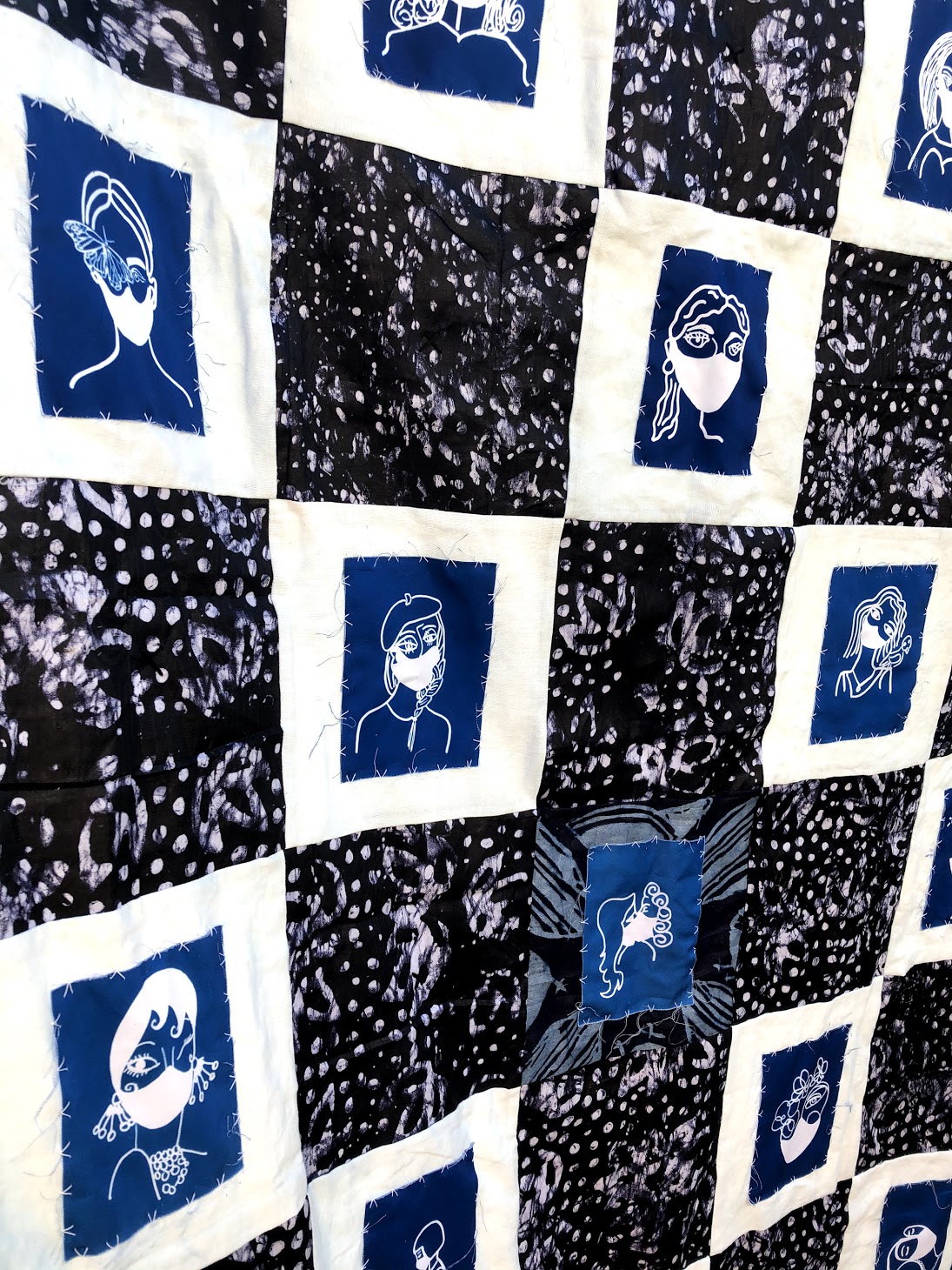 I pieced together indigo dyed fabrics (I dyed the light squares myself in Atlanta in 2014, and the darker blue squares are guinea brocade hand-dyed fabrics from Nigeria), which for me tie together the local and the global through traditions of making and speak to this moment of global connection, even as we must examine our own local responses to a range of issues, from medicine and healthcare to capitalistic failure and community. Indigo–from a plant, alive and bubbling in the dye vat–reminds me to connect to the wisdom of ecological interdependence, an especially important reminder in 2020, when the environmental crisis has become so urgent. I made positive drawings of masked women—the superheroines, I call them—and printed them on cyanotype fabric. These figures, appliquéd to the quilt, mark the shift in visual culture, especially in the States where protective and preventative face coverings became almost instantly—and destructively—politicized. But they also celebrate the beauty and fortitude of communities during this time, which includes the healthcare workers who have worked tirelessly and under difficult circumstances since March.