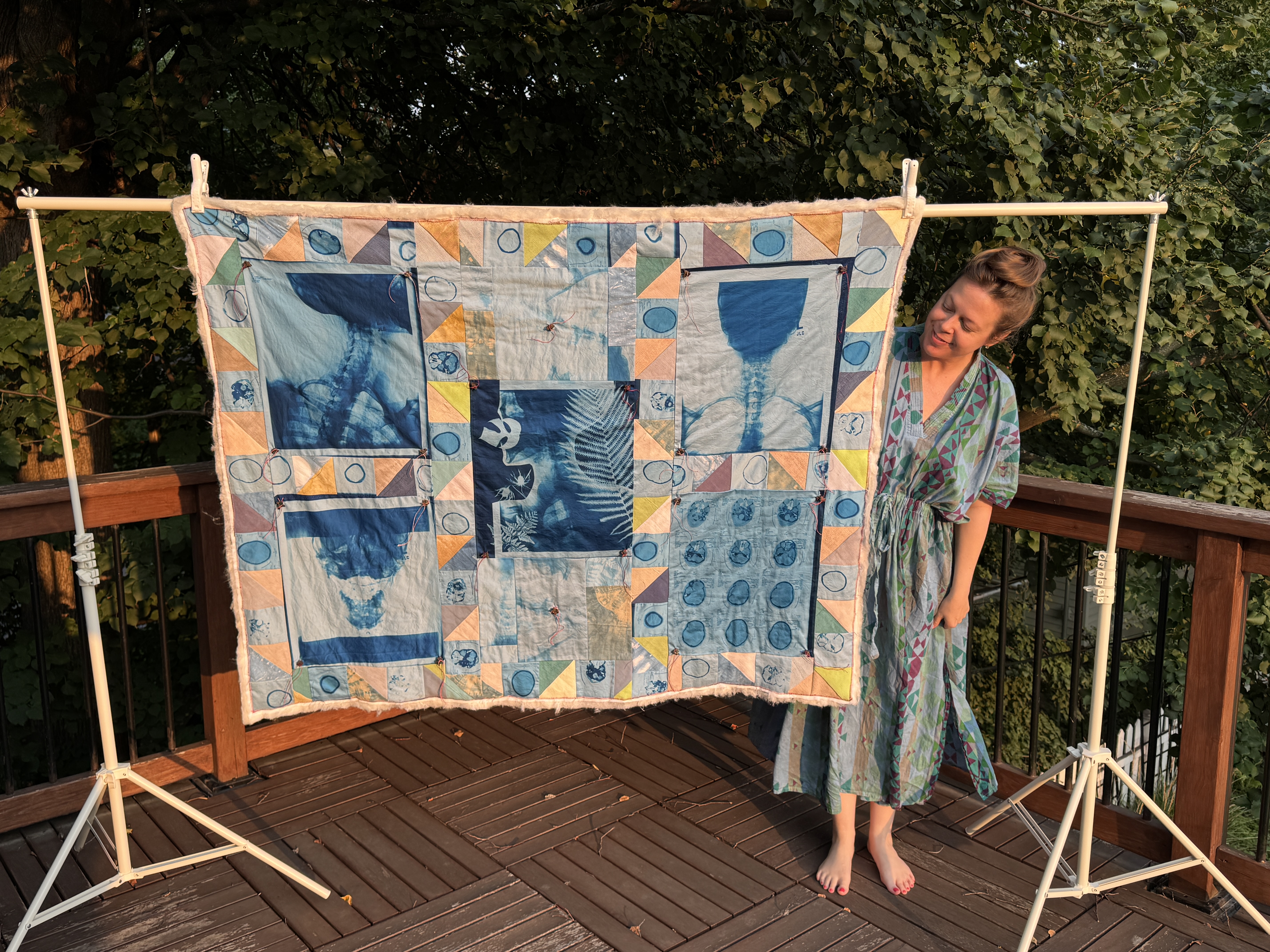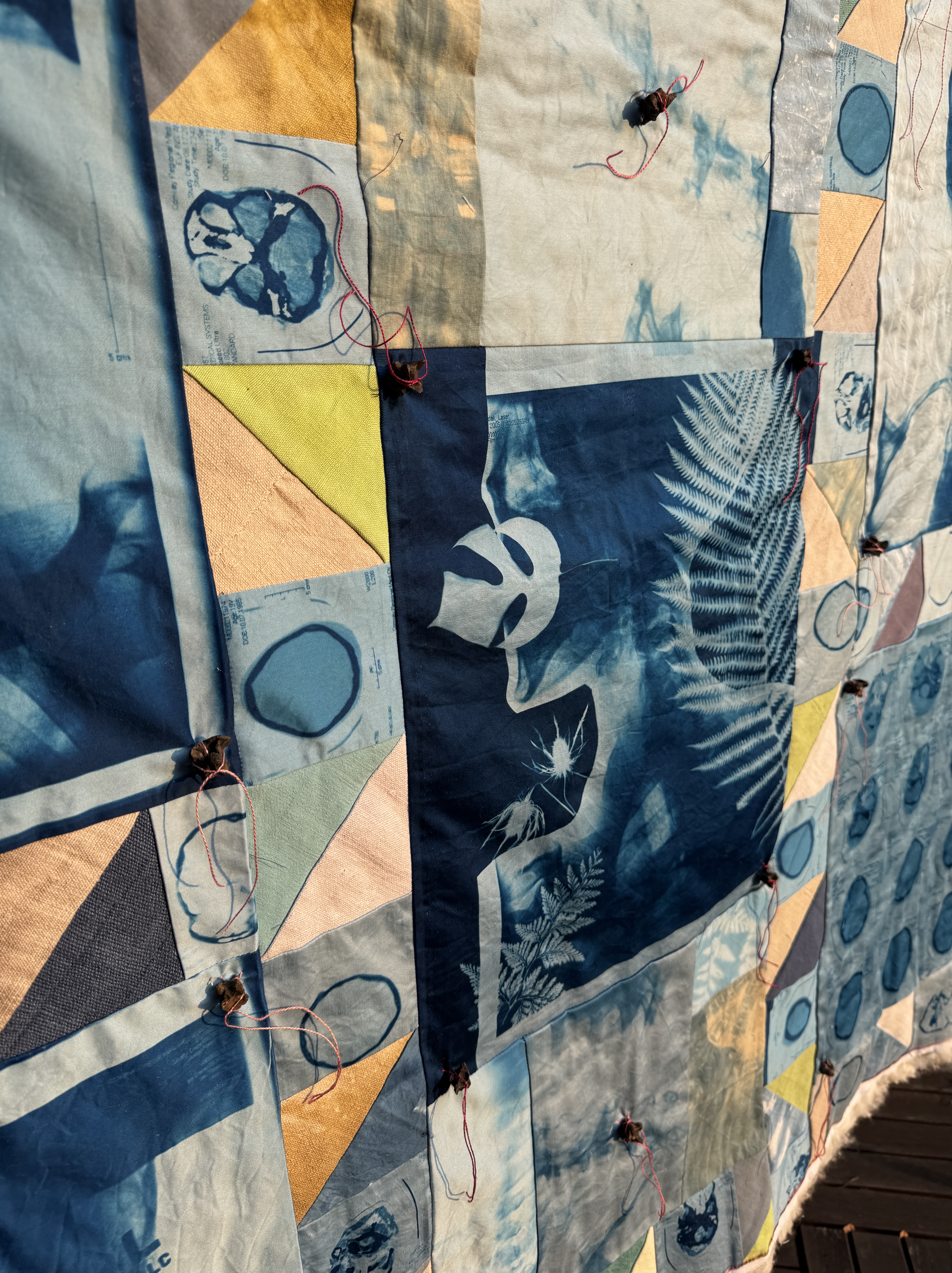The cyanotypes on the front of the quilt are made from my X-rays and CT scan films. These panels—and the brain scans in the quilt’s sashing, or margins—allowed me to collaborate directly with the project’s origin point. As an archives and material culture scholar, I’m endlessly fascinated by our personal archives and the ways in which artists respond to, remake, and reorient objects from the past. The cyanotypes also make the inside visible, bringing the internal body into an external, tactile form.