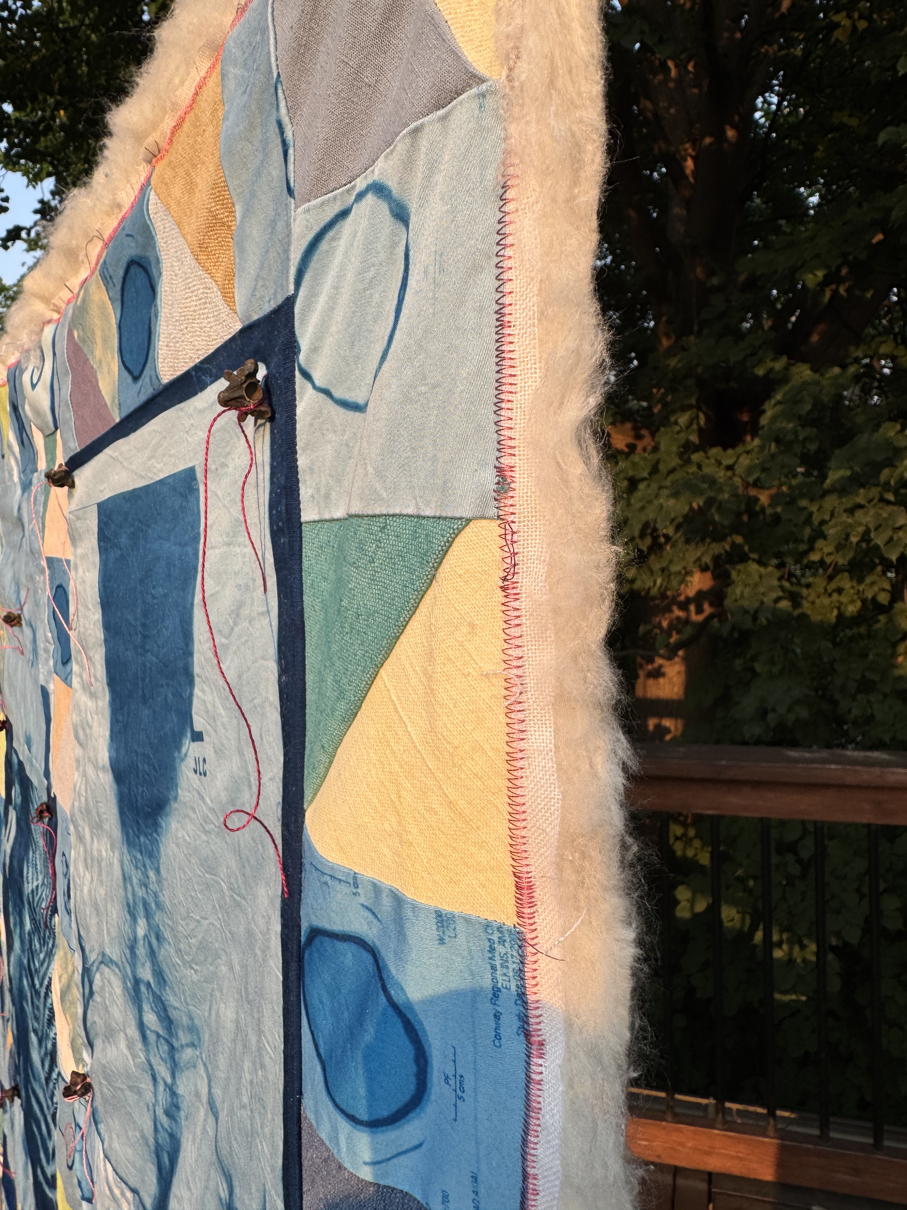 Eco-dyed fabrics, cyanotype, cochineal and madder-dyed thread, fossilized snake vertebrae, embroidered cheesecloth, and silk batting.