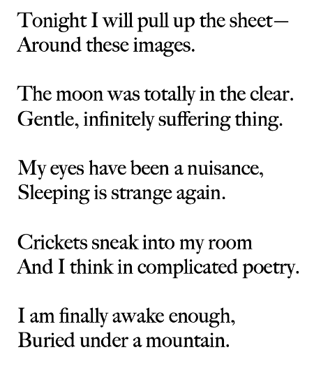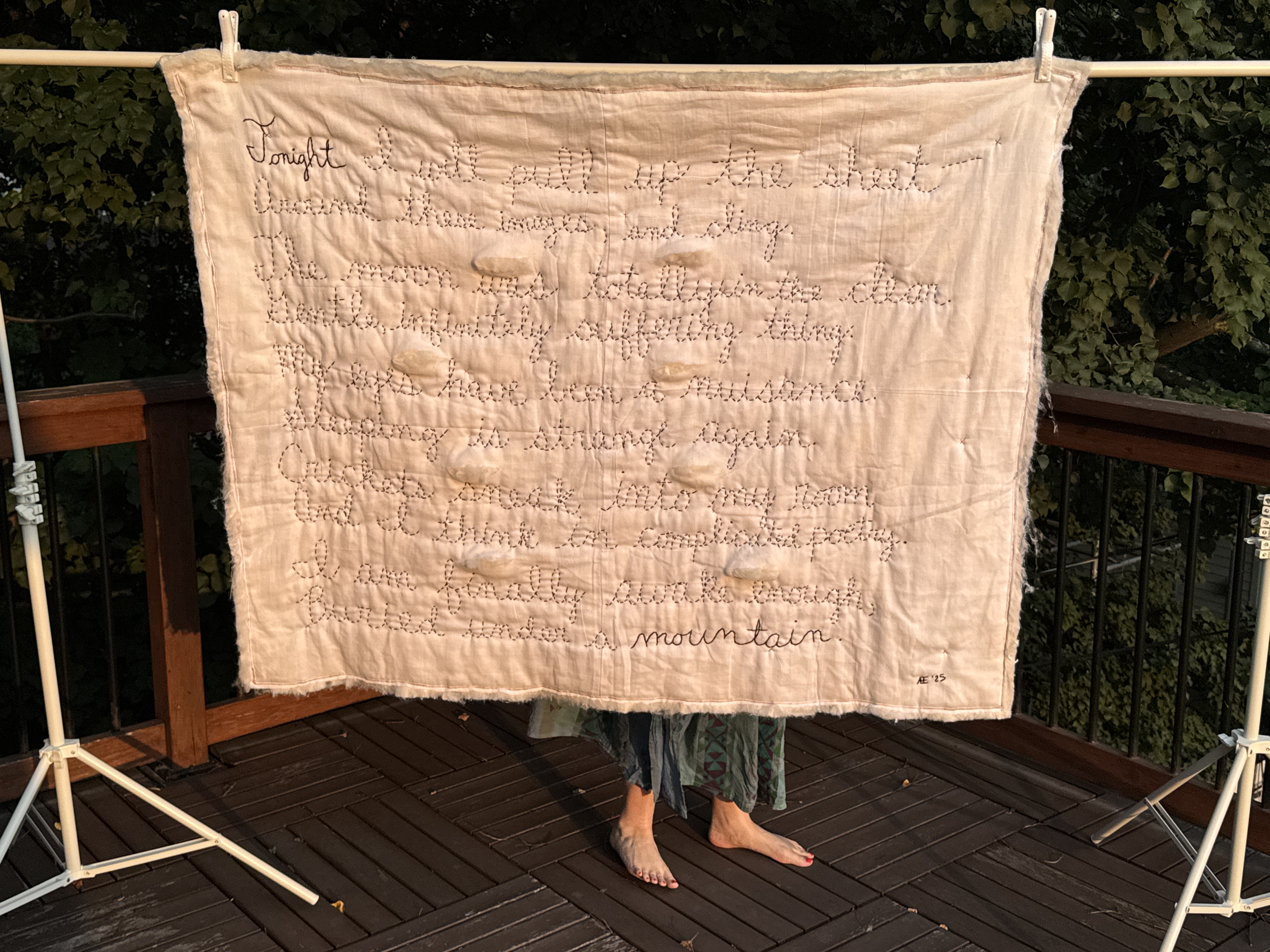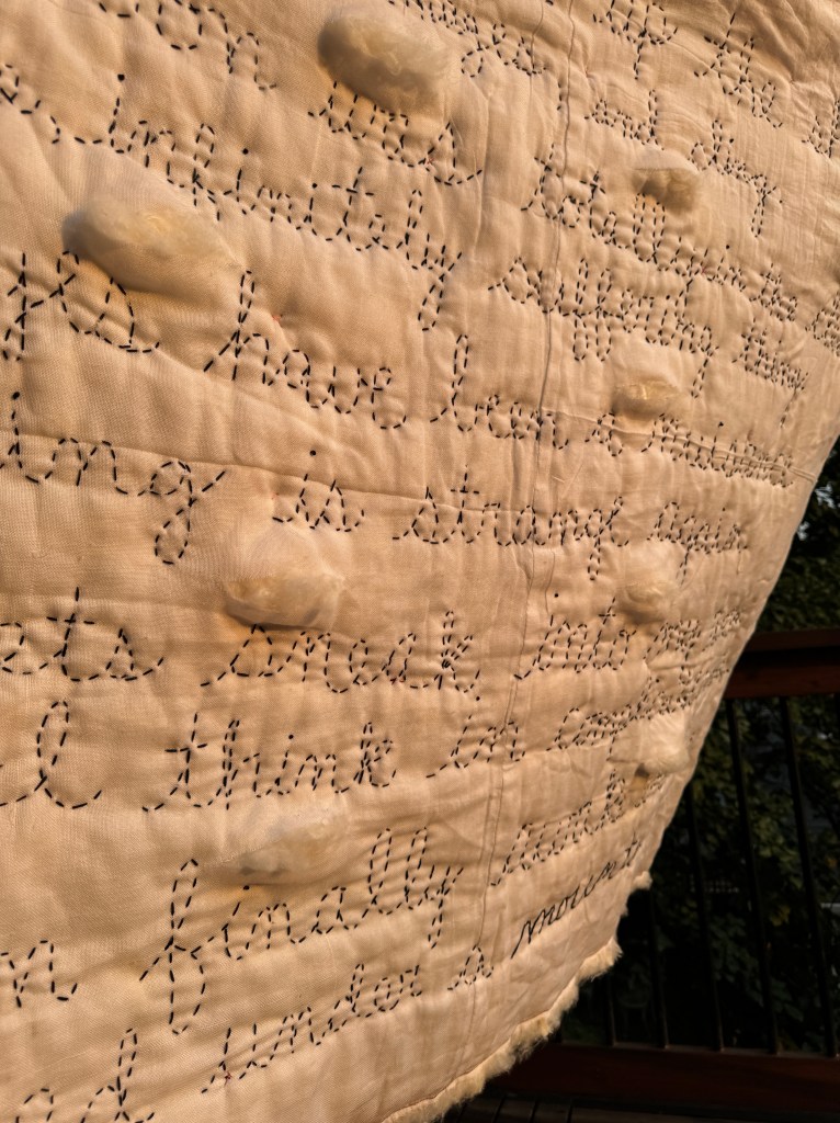 The cheesecloth quilt-back calls to mind medical gauze, and the silk batting it encases emerges between the embroidered stanzas (and around the quilt’s perimeter—the internal part of the quilt ends up being its binding, fully visible and undoing the quilt even as it holds it together).