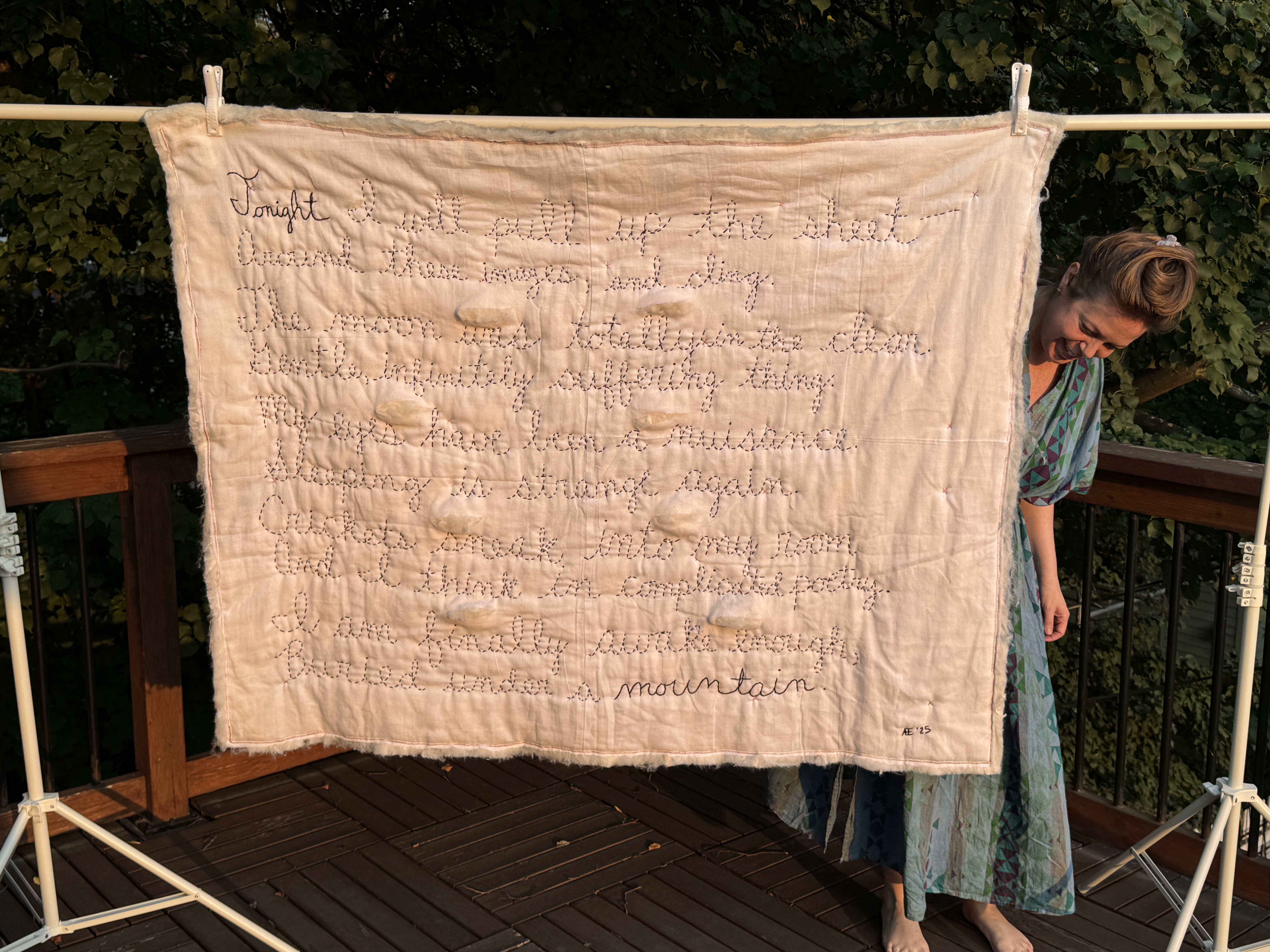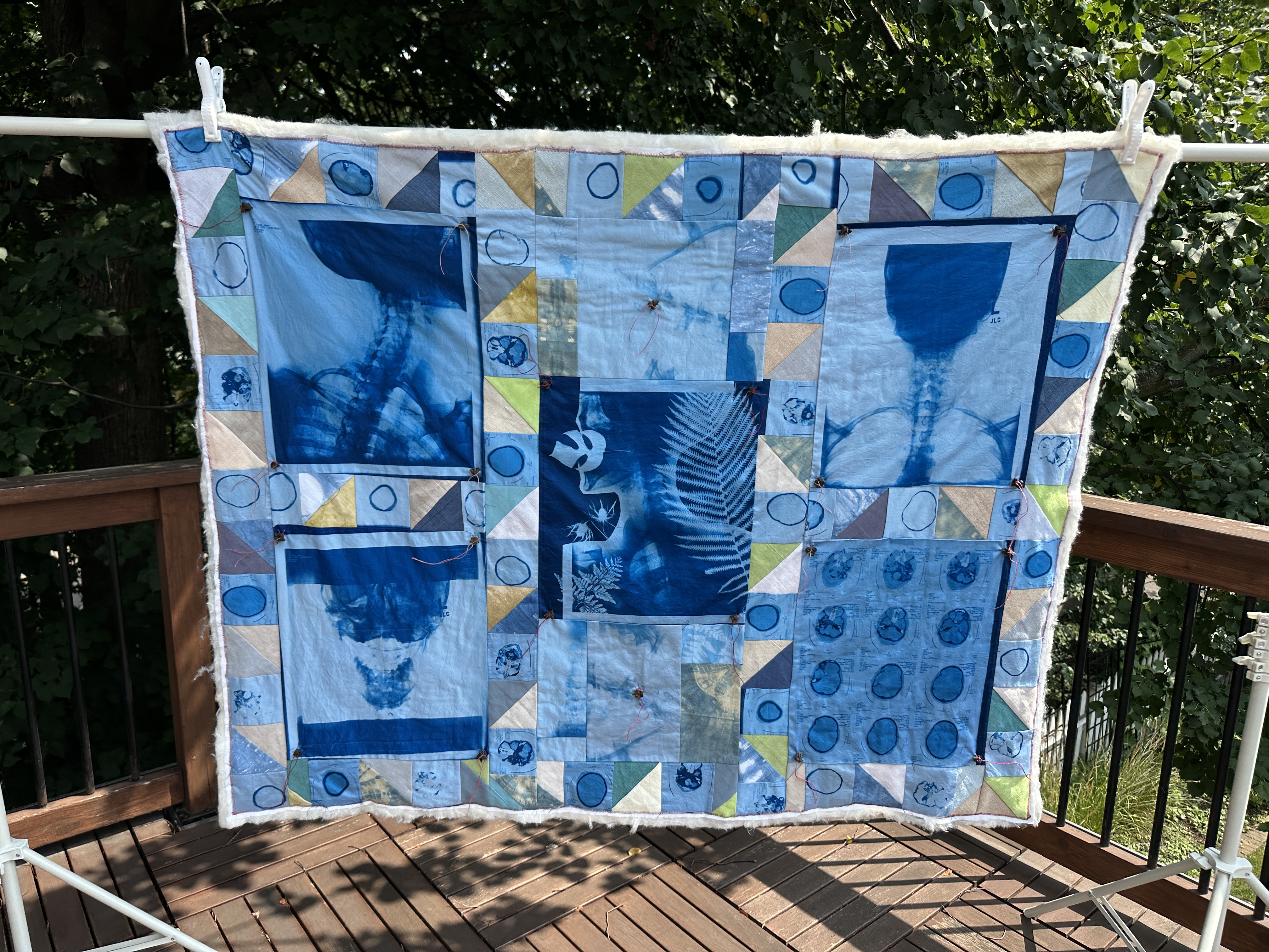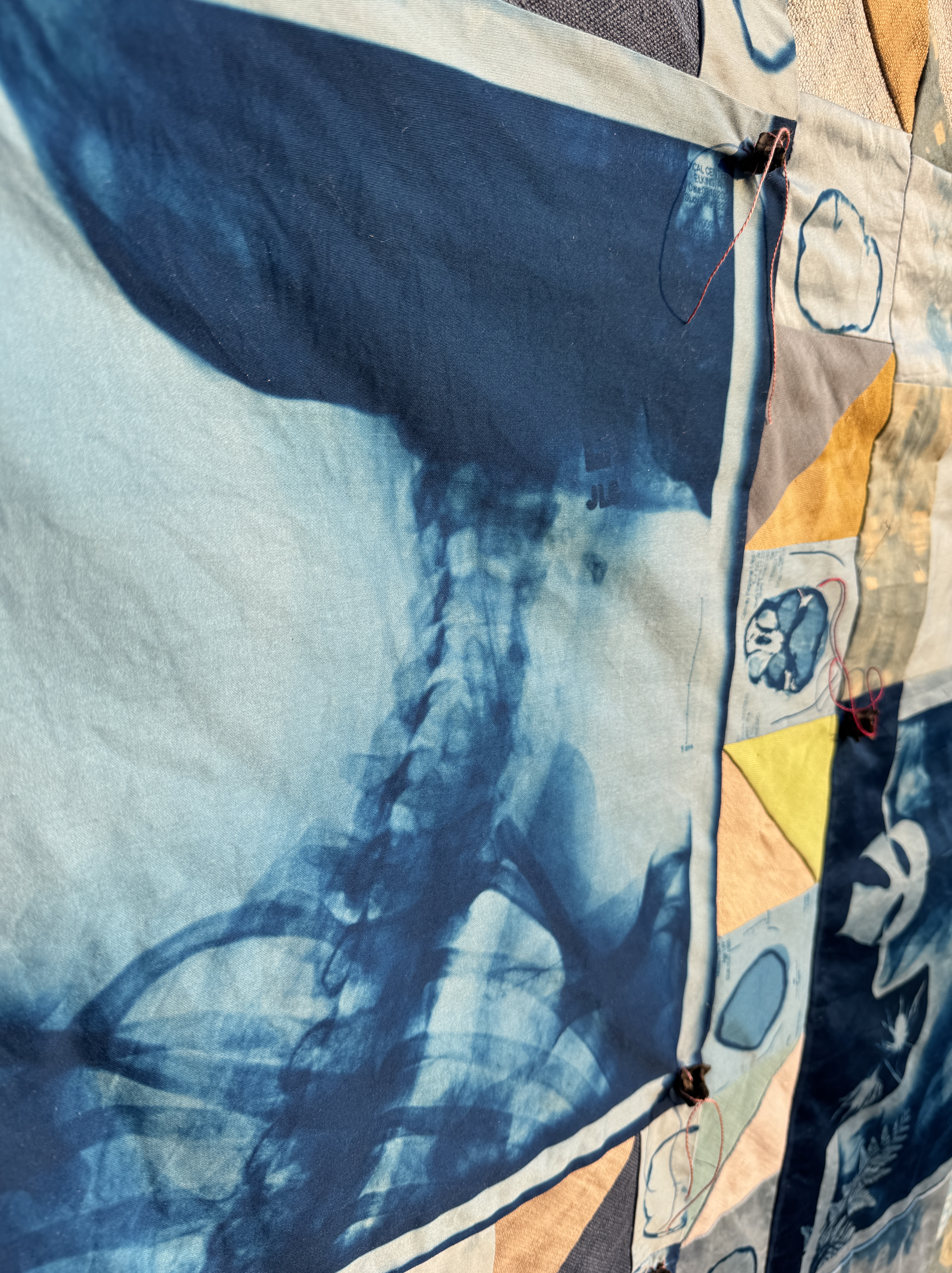 Eco-dyed fabrics, cyanotype, cochineal and madder-dyed thread, fossilized snake vertebrae, embroidered cheesecloth, and silk batting.